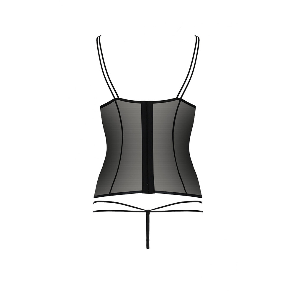 Black and red corset with decorative eyelets in the bra part and thong, which makes it unique. A sexy open bra and thongs on thin double straps show the qualities of a woman’s figure.